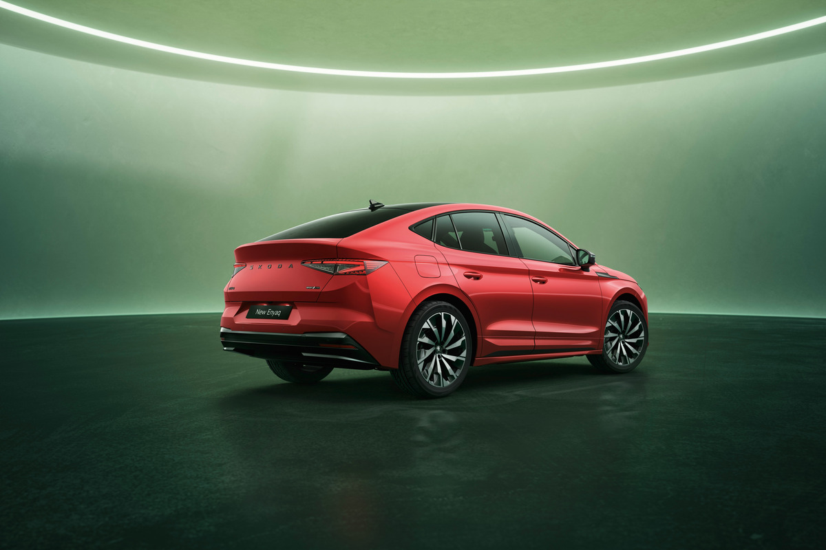 Den helt nye Škoda Enyaq Coupé Sportline representerer en perfekt symbiose av sportslig eleganse og avansert elektrisk teknologi. Med sin strømlinjeformede coupé-silhuett og markante detaljer som den sorte Škoda-logoen på panseret og Tech-Deck Face-fronten med LED-lys, utstråler bilen en tidløs og selvsikker holdning. Standardutstyr som LED Matrix-frontlykter og høyglanset sort finish på frontfangeren forsterker det dynamiske uttrykket, mens sorte vinduslister og felger på opptil 21 tommer understreker bilens sportslige karakter.
